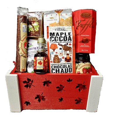 A red and white crate with cut our maples leaves will contain everything Canadian Maple Gourmet popcorn, Sask. Lentil Snacks, Delicious Maple Syrup, Ice Wine Tea, Summerland Fruit Snack, Summerland Strawberry Jam, Chili Lime Peanuts, Chocolate covered Saskatoon Berries, Delicate Truffle Chocolates, Canterbury Coffee, Maple Hot Chocolate, Maple Stroop Wafer.