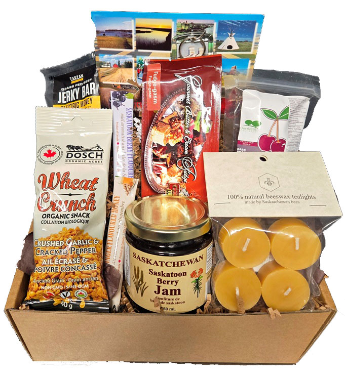Organic Cherry Bark, Grass Fed Jerky, Creamy Honey, Beeswax Tea Lights, Sask. Jam, Wheat Crunch, Moose Fudge, Sask. Postcard, Sask. Key Chain & Gift Box. Designed closed, with hand-tied ribbon & cello wrapped. (Due to availability of inventory we reserve the right to substitute items of equal or greater value when necessary)