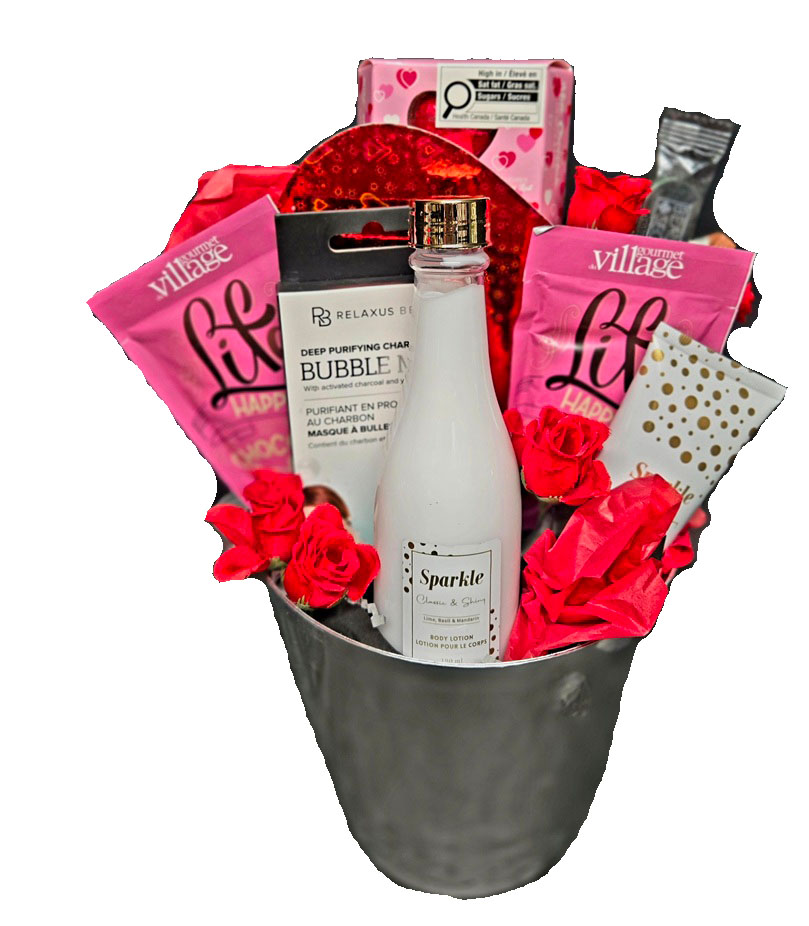 Designed a Silver Bucket: Chocolate , 2-Life Happens Hot Chocolate, Herbal and Chai Tea , Sweet & Salty Popcorn, Votive Candle, Face Mask, Body Lotion, Bath Bomb, Hand Cream, Beauty Nail File and Bath Scrubby. (Fragrances will vary based on inventory. Saskatoon Only)